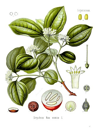 Strychnos nux-vomica, the strychnine tree, also known as nux vomica, poison fruit, semen Strychnos, and quaker buttons, is a deciduous tree native to India and to Southeast Asia. It is a medium-sized tree in the family Loganiaceae that grows in open habitats. Its leaves are ovate and 5–9 centimeters in size. Nux vomica is a tree. The seed is used to make medicine. Nux vomica contains strychnine and brucine, two toxic chemicals.