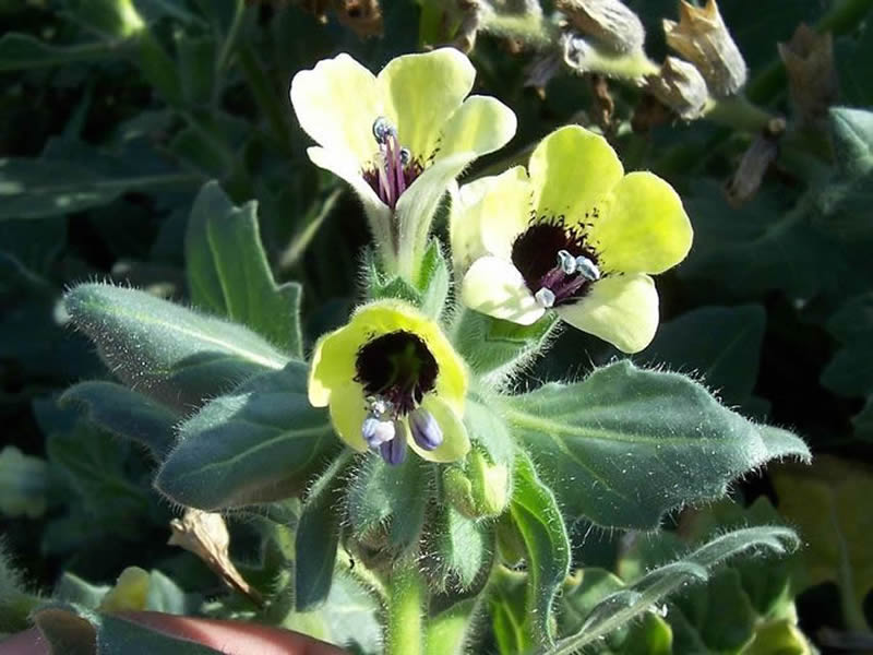 Black henbane (Hyoscyamus niger) has a long history as a notorious toxic as well as a beneficial medicinal plant. The pale yellow, bell-shaped flowers with purple veins are a diagnostic feature of this species. The plants grow up to 36 inches tall and have hairy leaves that are sticky to the touch. The history of henbane, similar to other highly poisonous and notorious members of this family such as mandrakes and daturas, can be traced back to at least 4,000 B.C.