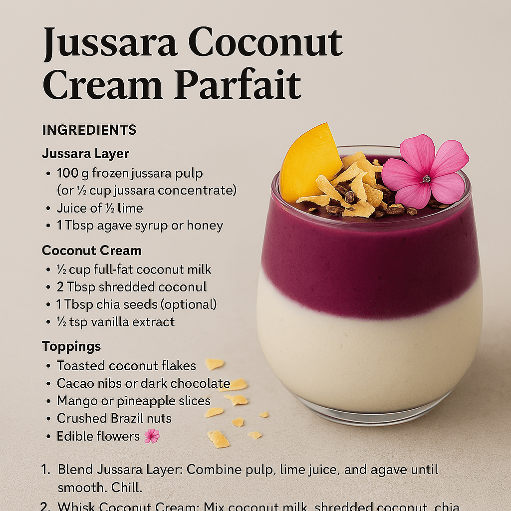 - Blend 100 g fresh or frozen jussara pulp with banana, almond milk, and honey for an antioxidant-packed smoothie bowl.2