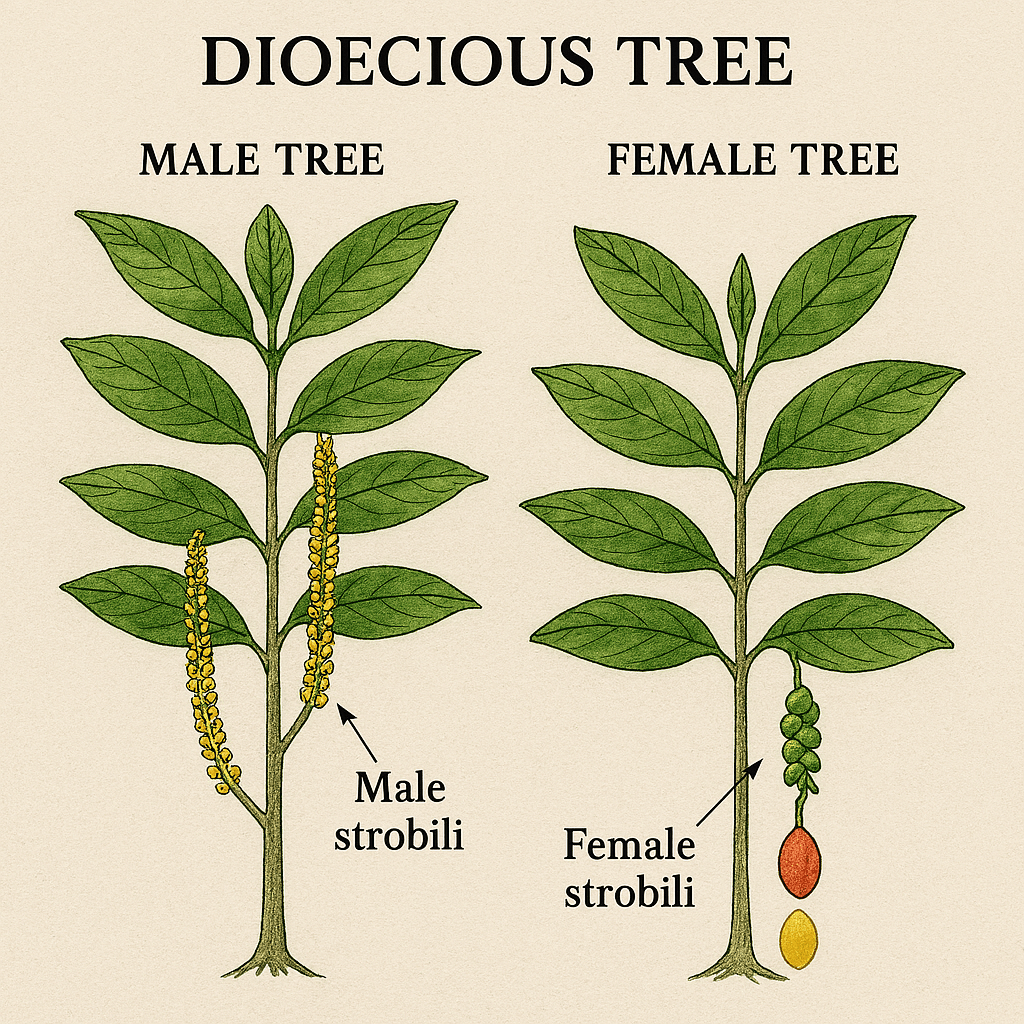 Despite its gymnosperm classification, it often resembles flowering plants due to its fruit-like strobili and broad leaves.