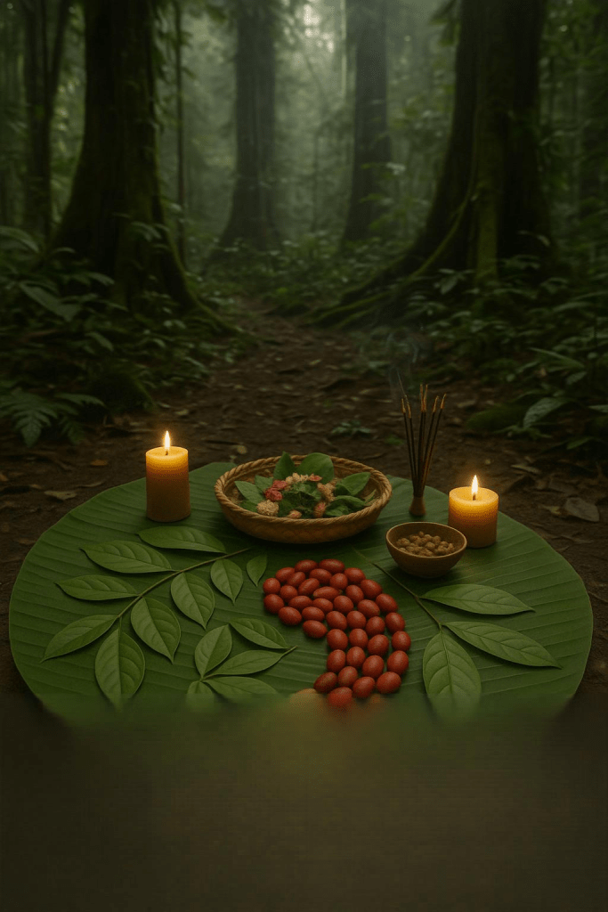 Forest Altar SceneāMelinjo leaves encircling offerings, beeswax candles flickering in filtered forest light. T
