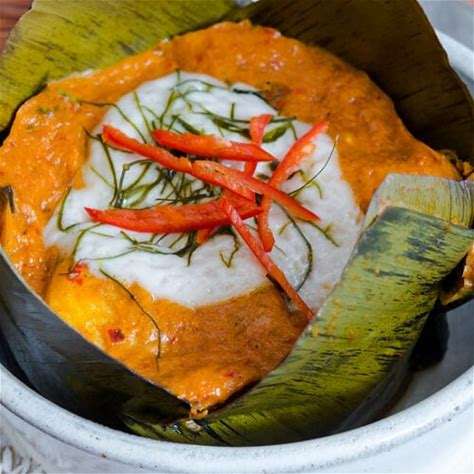 Cambodian Fish Amok, a traditional steamed fish curry often served in banana leaf cups. While most classic recipes use spinach or moringa leaves, noni leaves are a culturally authentic substitute in some regions for their earthy bitterness and medicinal value.