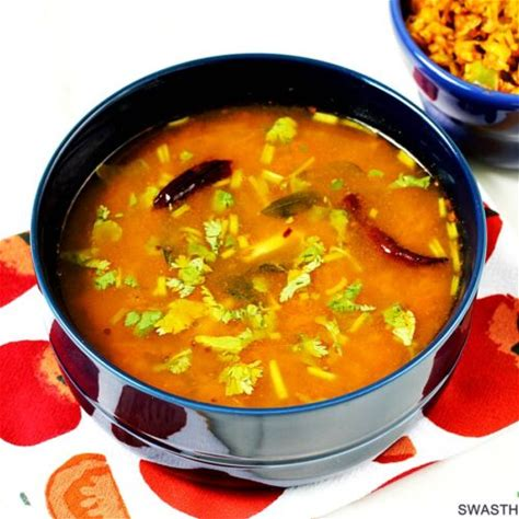 A tangy, spiced tomato broth served as soup or over rice. Key Ingredients: Fresh tomatoes, tamarind, garlic, rasam powder, curry leaves Health