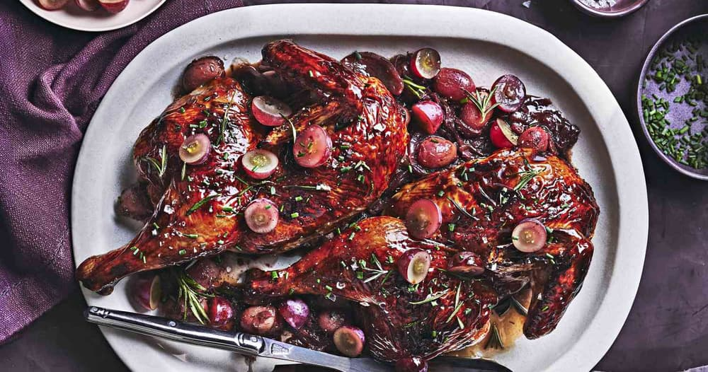 Glaze chicken with a red wine reduction and stewed Oolins Grapes. Serve over caramelized onions for a rich, aromatic main dish